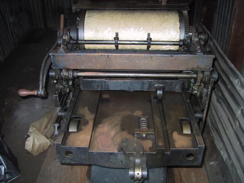 View from the front. See both feed tables, the cylinder, and the supports for the rollers. The machine is completely manual.