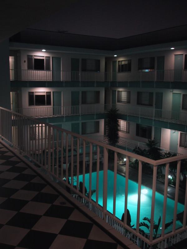 The courtyard of the Beverly Laurel Motor Hotel. Haze in the sky. Ice-cold water in the pool. | |